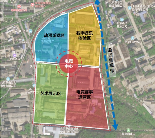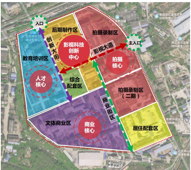 北京燕山影视文化产业基地(燕山影视文化生态小镇)位于北京市房山区,总体规划1000亩,通过对燕山老厂房的空间改造,打造以影视制作为核心,逐步发展创意设计、人才孵化、视听科技等数字技术,进而衍生电竞、动漫游戏、艺术展示、数字娱乐体验等关联产业,构建完备的影视文化产业生态体系,形成“1+3 +N”的影视娱乐产业集群,打造北京老工业区转型升级示范园区。