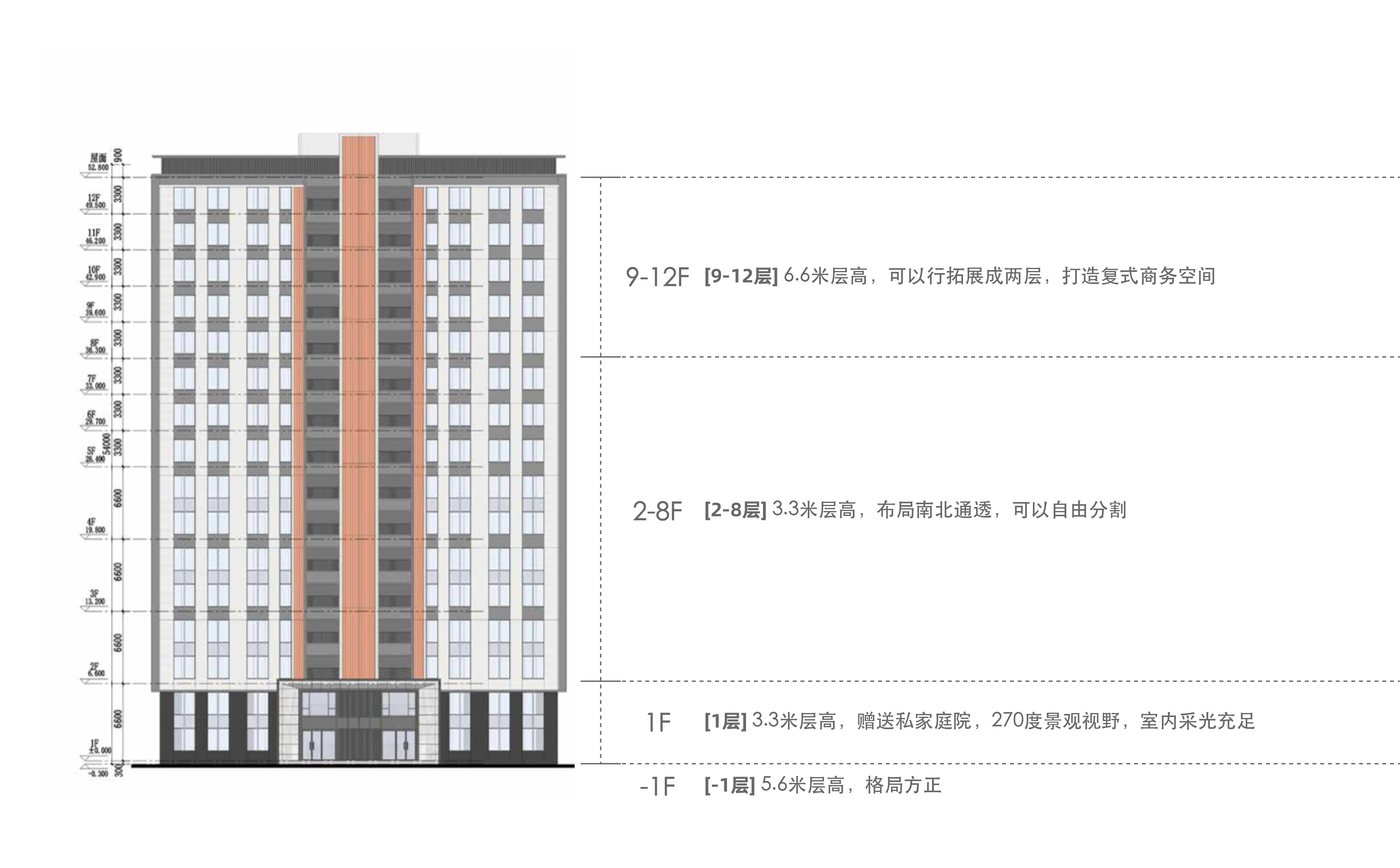 层高:1~8层为层高3.3米平层,9~12层,层高6.6米复式
