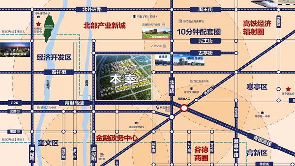 交 通:公路:青银高速旁,距离青银高速入口2.5km;机场:距离潍坊机场10km;高铁:距离高铁北站7km,距离潍坊火车站7km;轻轨:靠近潍坊新规划轻轨3号线;