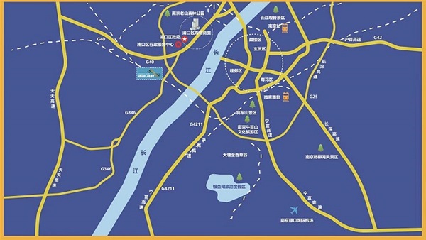 交 通:高速:两桥两隧三轨”(长江大桥、三桥,长江隧道、扬子江隧道,以及地铁10号线、3号线、S3号线)与江南主城相连。 高铁:到南京火车站、南京南站和禄口机场仅半小时车程。 机场:距离南京浦口机场仅半小时车程。