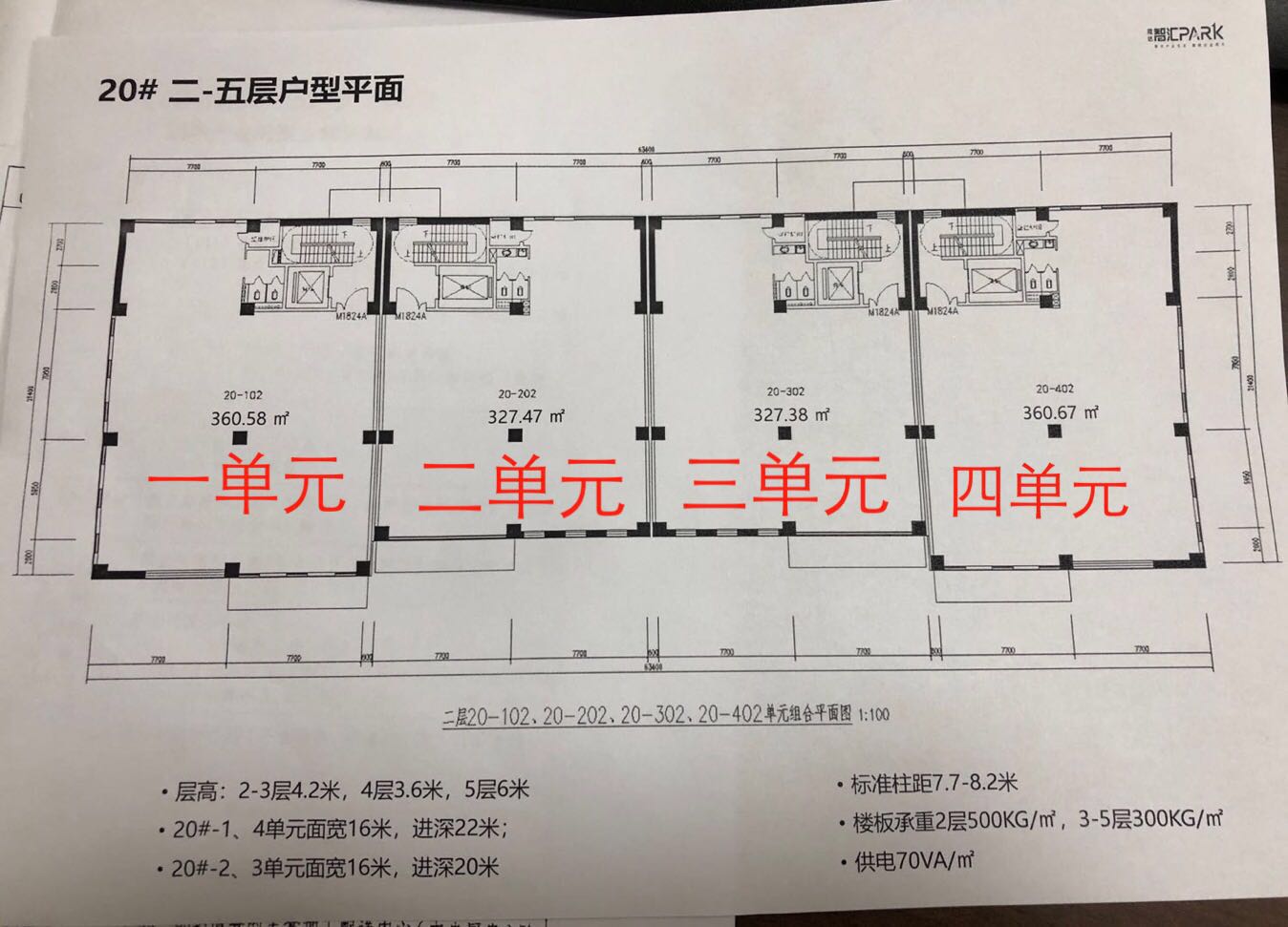 首层层高6米 承重2吨/平米,2·3层层高4.2米,4层层高3.6米,5层层高6米可做隔层,赠送屋顶花园