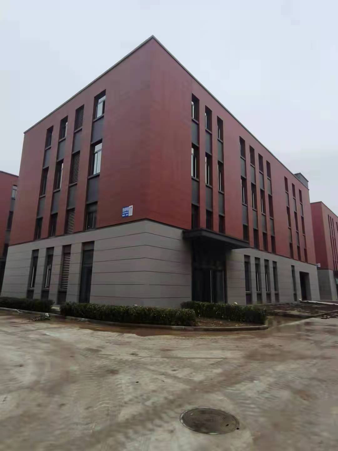 厂房结构形式为框架结构,外立面一改以往灰色为主的传统设计,采用色彩明快的红白灰三色相间仿石涂料。外观整体高贵、庄重的同时又体现了企业的科技感,同时仿石涂料耐污染强,不易褪色,可整体提升和保证入园企业形象。